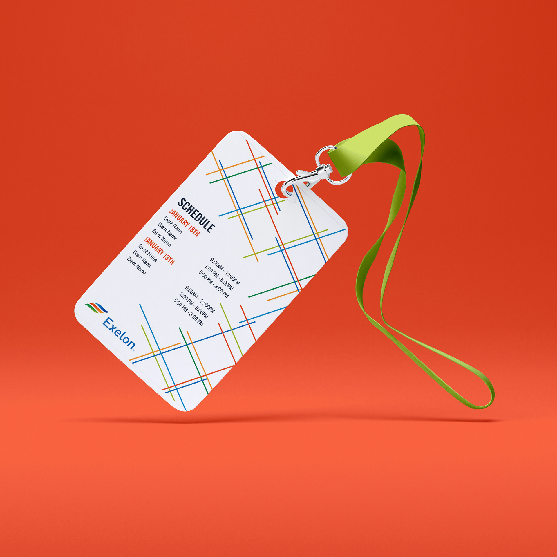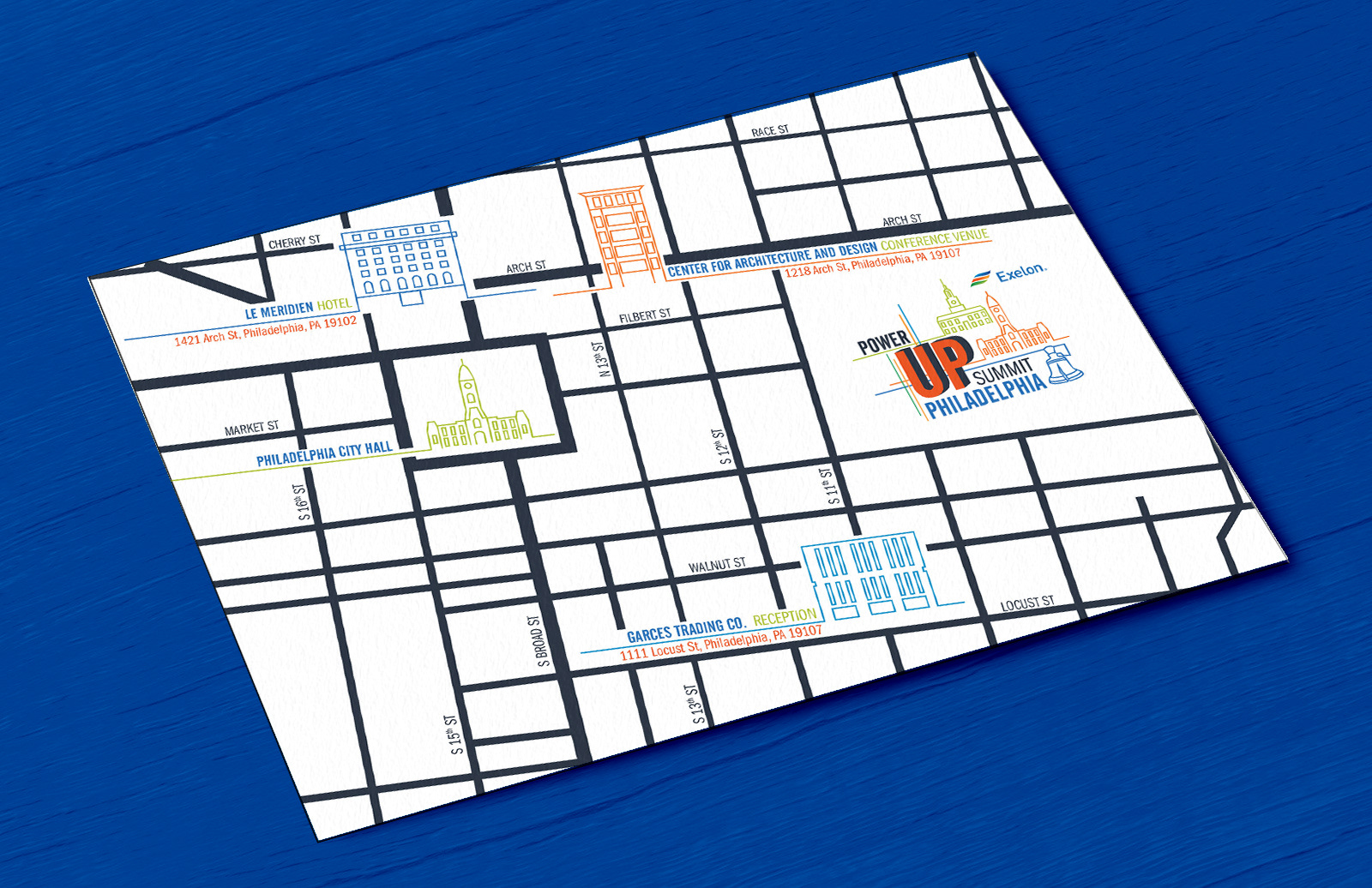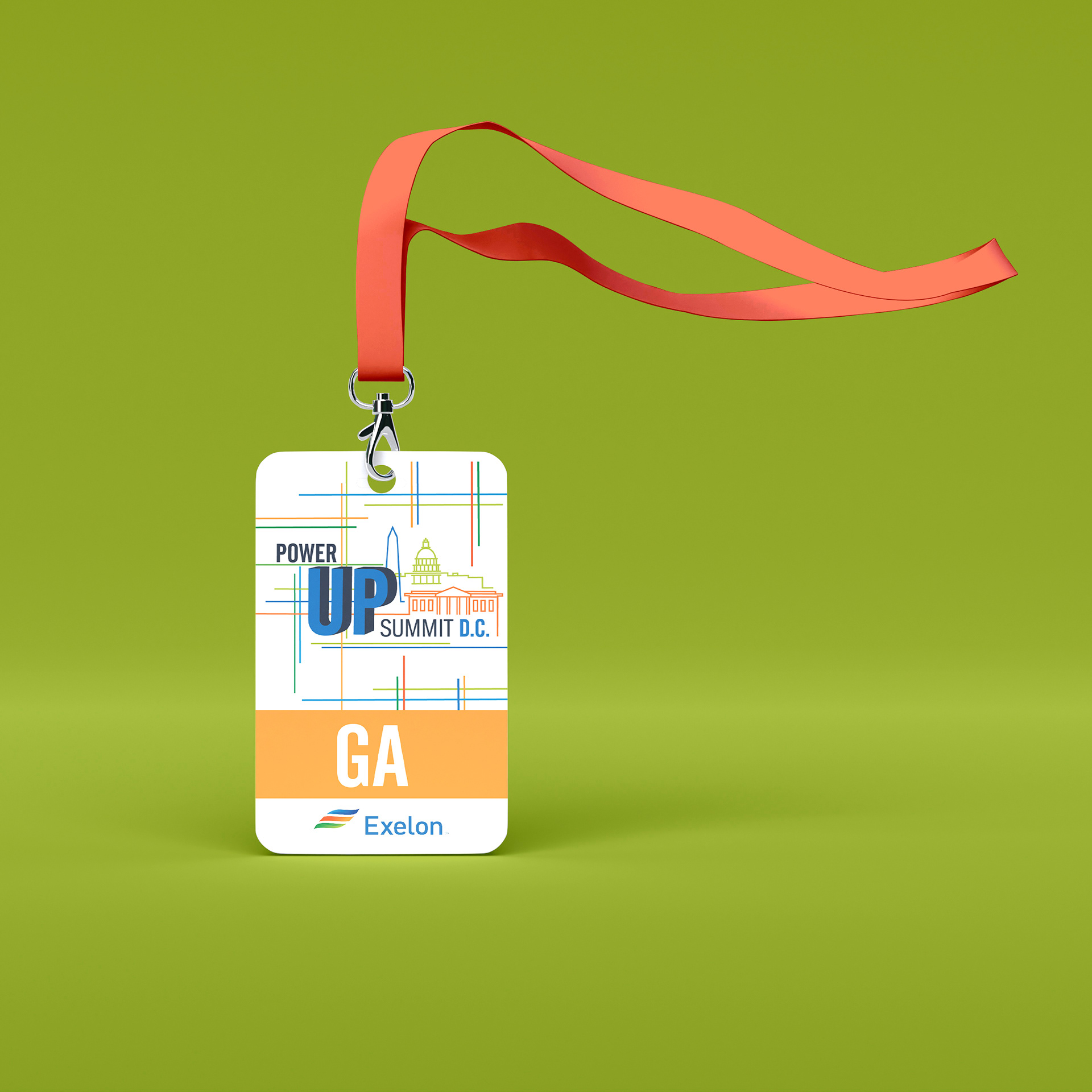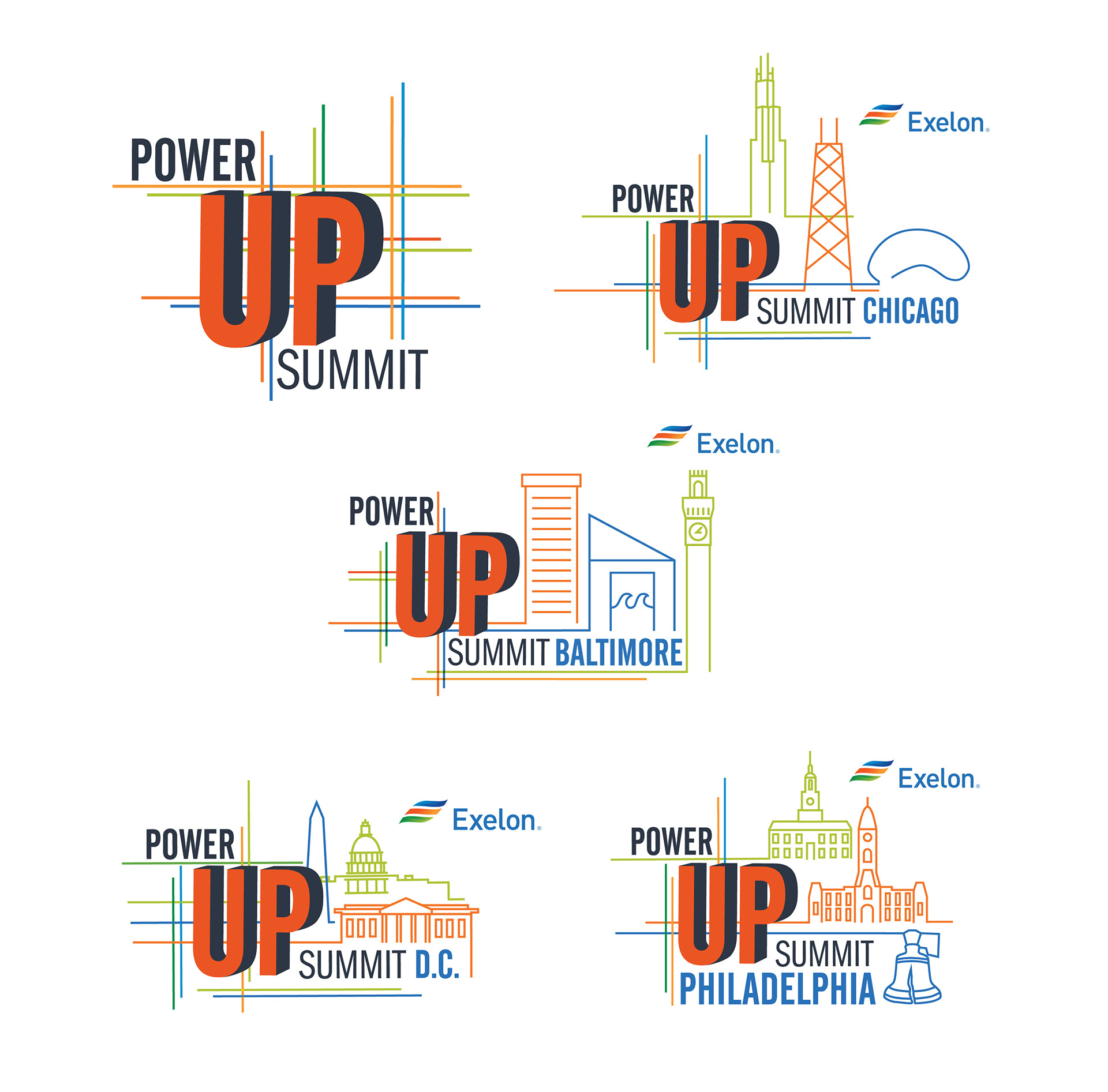 In 2018 the Exelon Corporation requested the design of a cohesive brand that could be utilized for a series of conferences spanning throughout the country from Washington D.C. to Chicago. With approximately 10 million customers, the Exelon company is a major distributor of natural gas and electricity in the United States. The chosen logo for the conference nods to Exelon’s ability to “power up” cities; composed of multiple intersecting power lines that meet to form landmarks distinct to each conference location. The logo and brand were used throughout the conference to create an immersive environment for attendees to discuss major industry topics. From the stage to the registration desk, to a down-time lounge, the spaces were transformed through the use of the brand’s logo, colors, and intersecting lines. Attendees were also given branded giveaways such as notebooks and pens. Created for Design Foundry Events under the direction of Event Designers, Meghan Malik and Samina Vieth. Event was for the client Exelon.